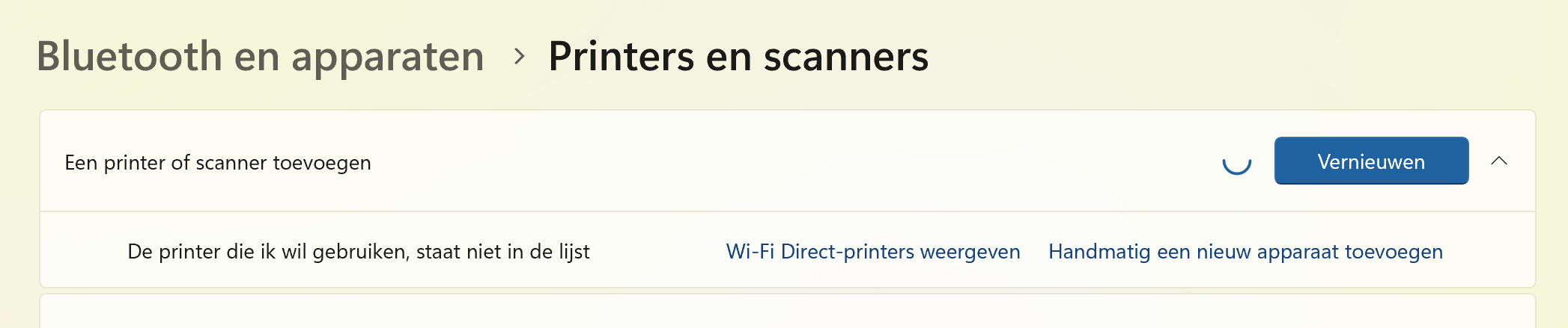 Windows gaat nu zoeken naar beschikbare printers. - Druk op 'handmatig een nieuw apparaat' toevoegen.