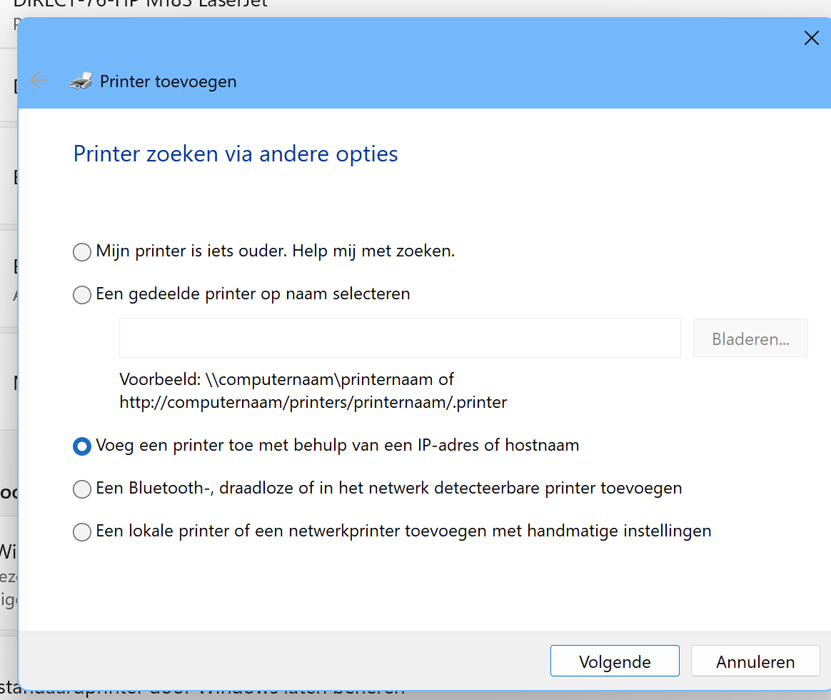 - Kies in het vervolg venster de optie die van toepassing is. "Een TCP/IP-adres of hostnaam gebruiken om een printer toe te voegen". Dit is vaak de optie die gebruikt wordt voor netwerk printers.