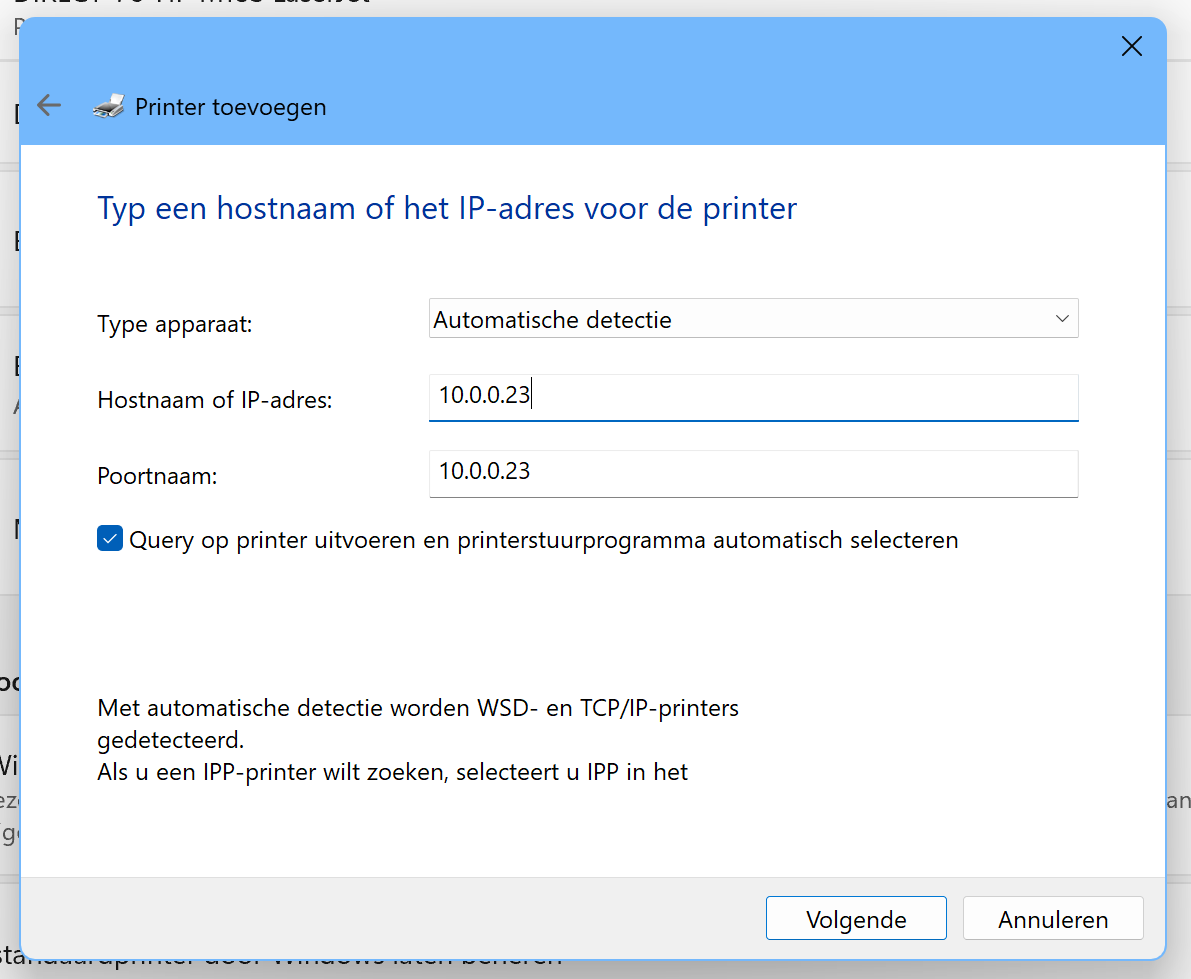 - Select "Automatische detectie" en voer het IP-adres 10.0.0.23 van de printer in.
