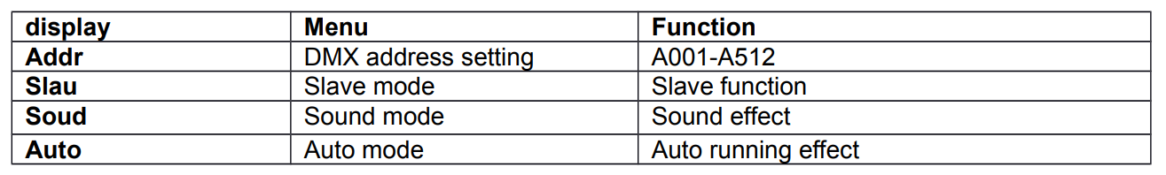 ADDR: DMX address setting, used to determine the DMX starting channel. From this channel on, the fixture will respond to values, corresponding with the amount of channels that the fixture is occupying. (For example, when you set the starting address to value 003, the fixture will respond to channels 3, 4, 5, etc.)