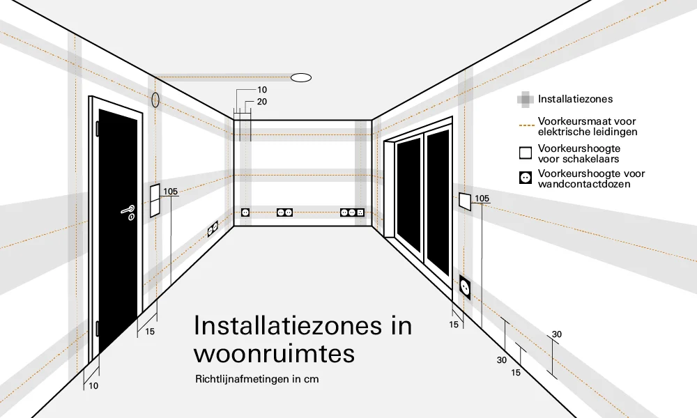 10-30 cm, met een voorkeursmaat van 15 cm. Dit voorkomt obstakels bij het openen van deuren en ramen en zorgt voor een ergonomische plaatsing van schakelaars.